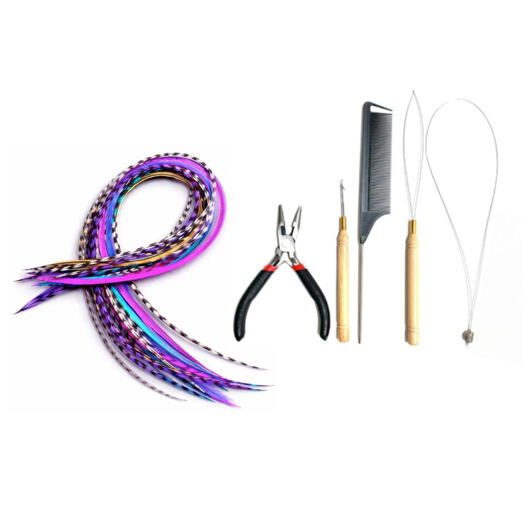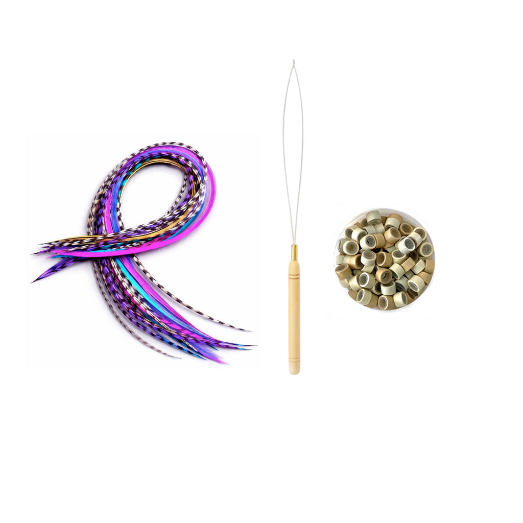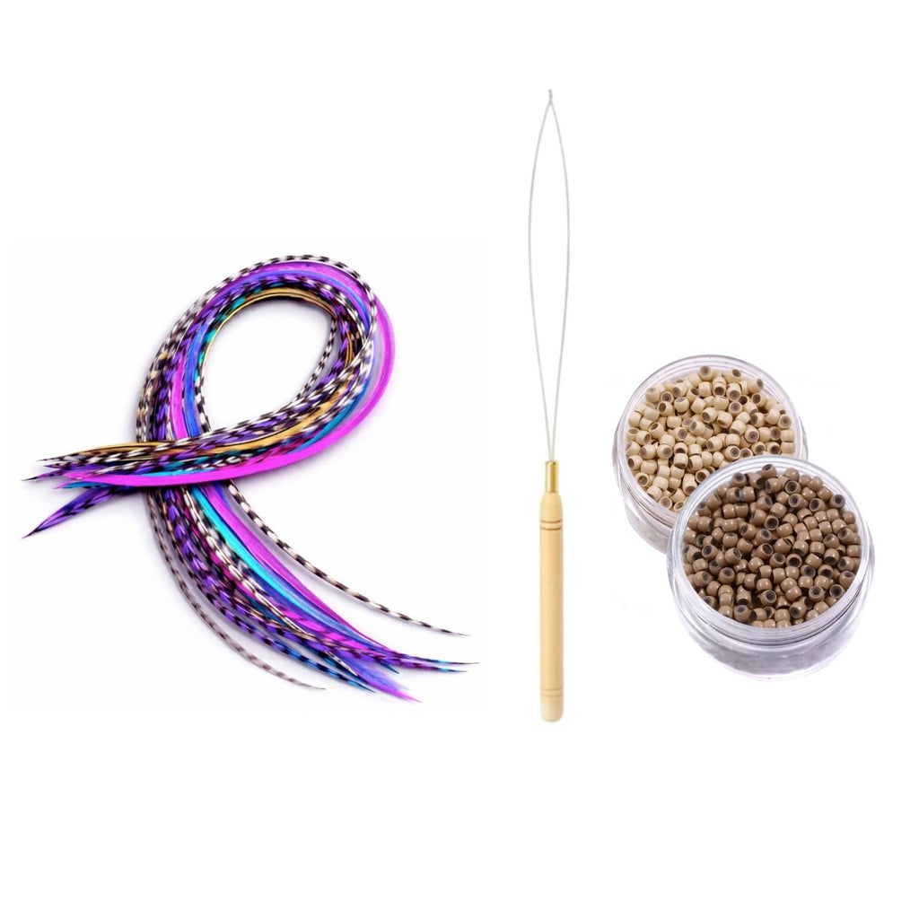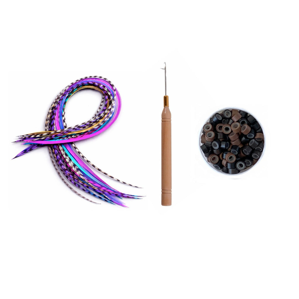 Make your hair instantly magical with this 20-piece Super Long Feather Pack, designed for bold colour lovers and dreamy mermaid-length styles. Each set blends bright statement colours with natural black + white grizzly feathers, giving you a stunning, dimensional finish no matter your hairstyle.