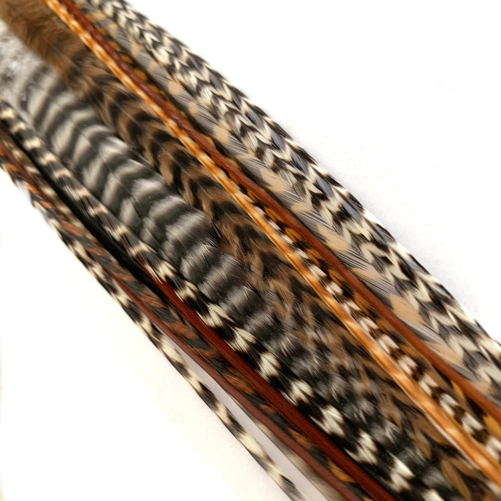 Premium 12-piece Feather Hair Extensions Naturals Mix featuring wide and skinny natural grizzly feathers in mixed lengths for layered boho, festival and everyday hairstyles.