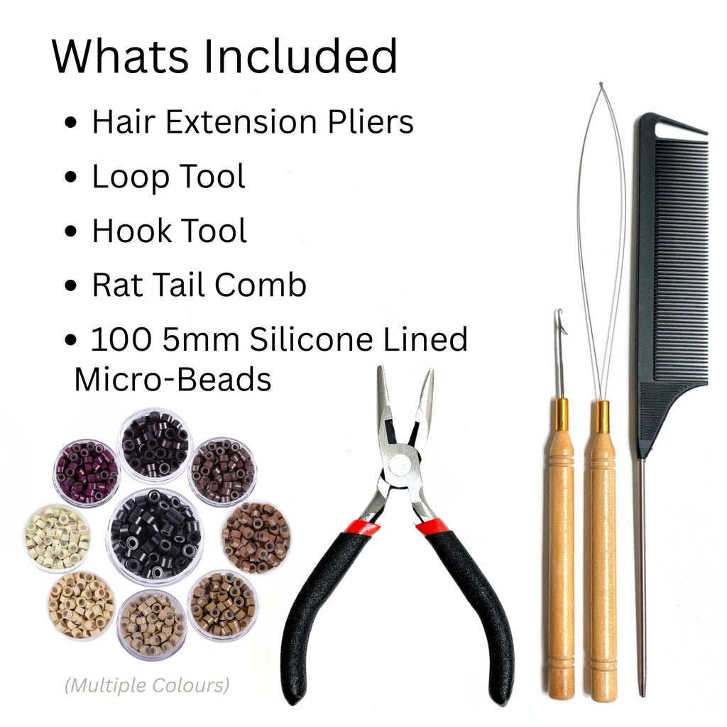 All-in-one, salon-quality Hair Extension Complete Starter Kit — everything you need to install hair extensions and feathers with micro and nano beads with confidence.