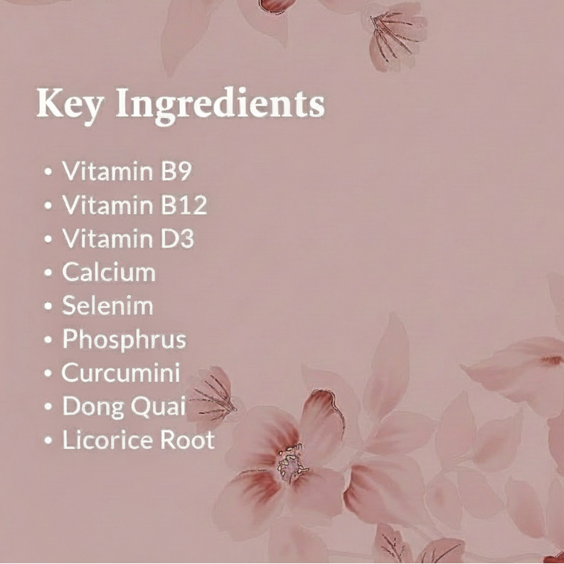 🌿 Vitamins + Herbal Extracts – A gentle blend of vitamins and plant-based ingredients chosen to support overall menopause wellbeing.