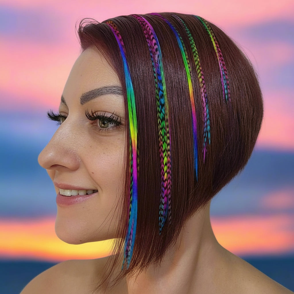 🌈 Add instant colour + festival vibes with these incredible set of rainbow solid and grizzly feather hair extensions