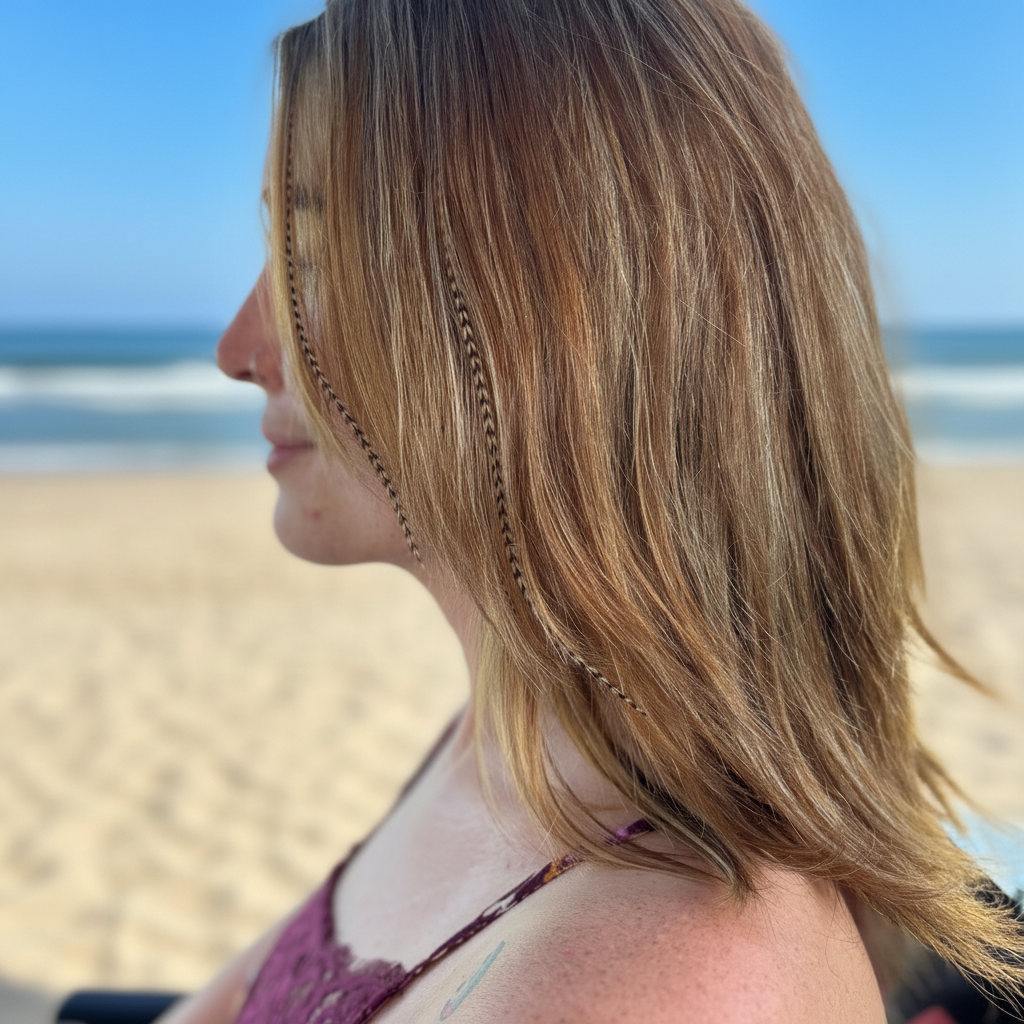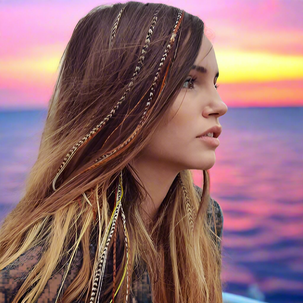Introducing 16pc XL WIDE n’ SKINNY Naturals Mix feather extensions in beautiful natural grizzly tones. Extra Long, natural grizzly feathers in wide, semi-wide and skinny styles. Consistent long lengths, reusable, heat-friendly, and perfect for boho, festival, and everyday styles-wash, curl, straighten and blow-dry just like your hair. Easy to apply with rings and a hair tools. Pack $65.90 (Value $192 , XL Feathers retail $12ea)