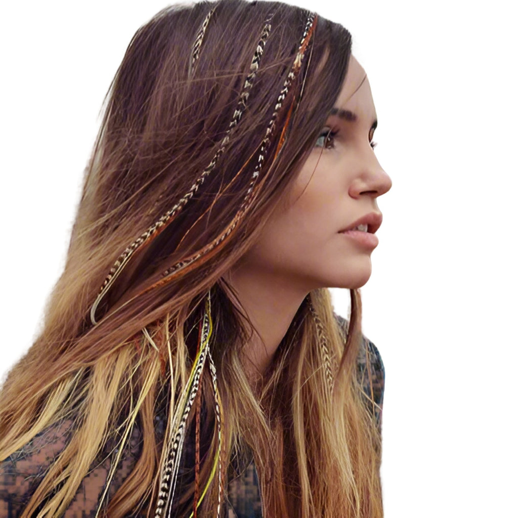 Premium 16-piece XXL Feather Hair Extensions Naturals Mix featuring wide, semi-wide and skinny natural grizzly feathers for bold boho, festival and mermaid hairstyles.